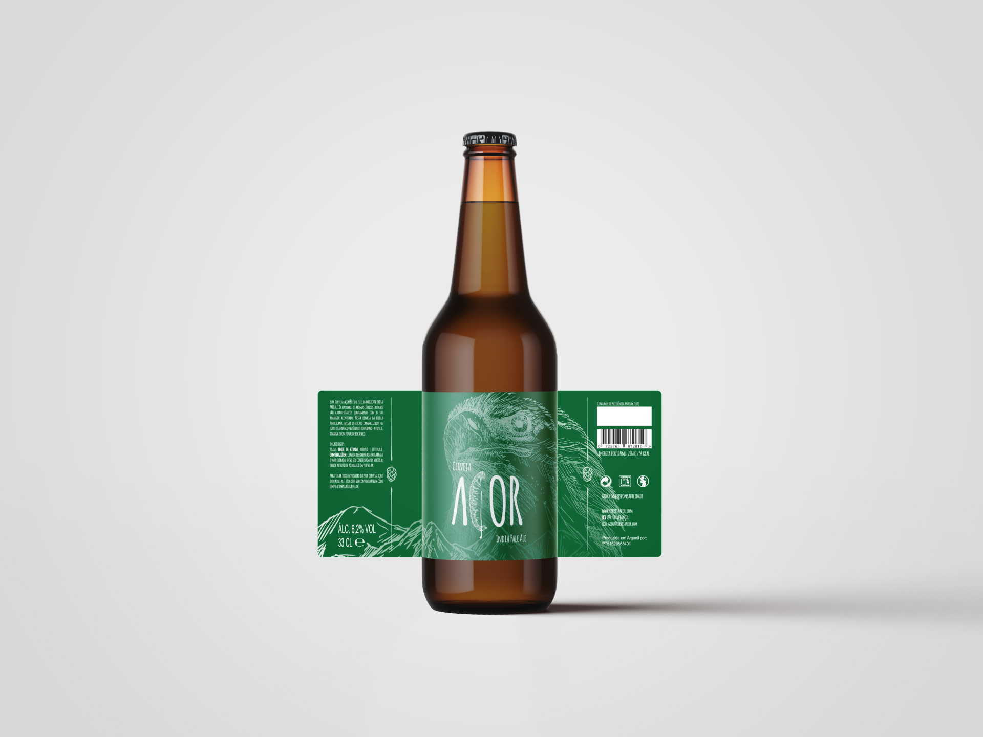 Garrafa de cerveja castanha com rótulo verde e texto 'ALCOR'
